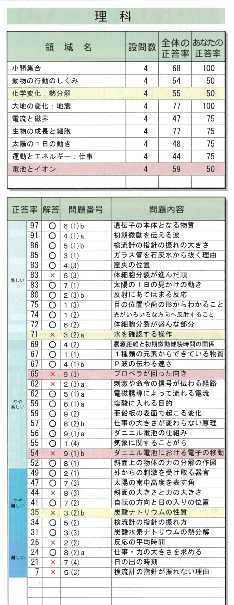 領域では「電池とイオン」が赤く表記されています。ここをまず復習すべきです。具体的に見ていくと、この領域は全体の正答率が59%に対して自分の正答率は50%です。