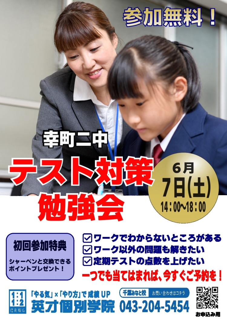 こんにちは、幸町二中に最も近い個別指導学習塾、英才個別学院千葉みなと校です。