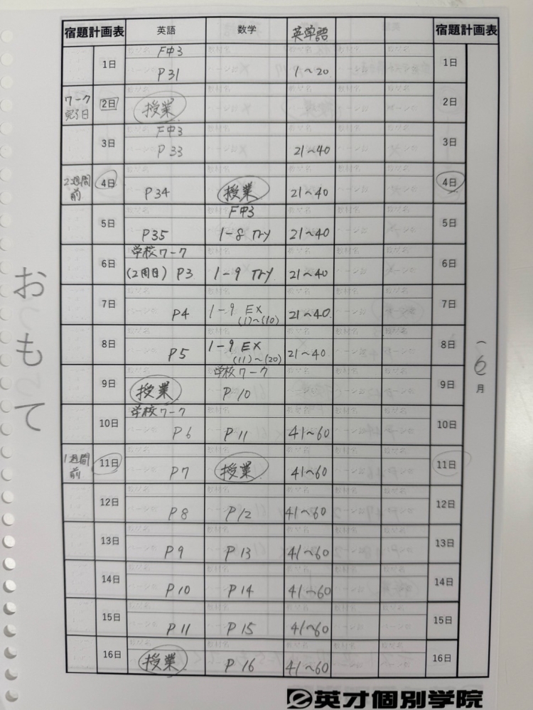 この計画表では、ただ宿題を出すだけでなく、生徒自身が「今日はどこをやるべきか」一目でわかるように日割りで宿題を出しています。