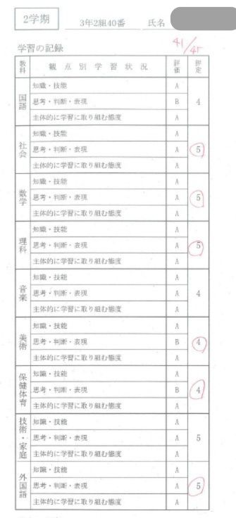 中学3年2学期の成績が