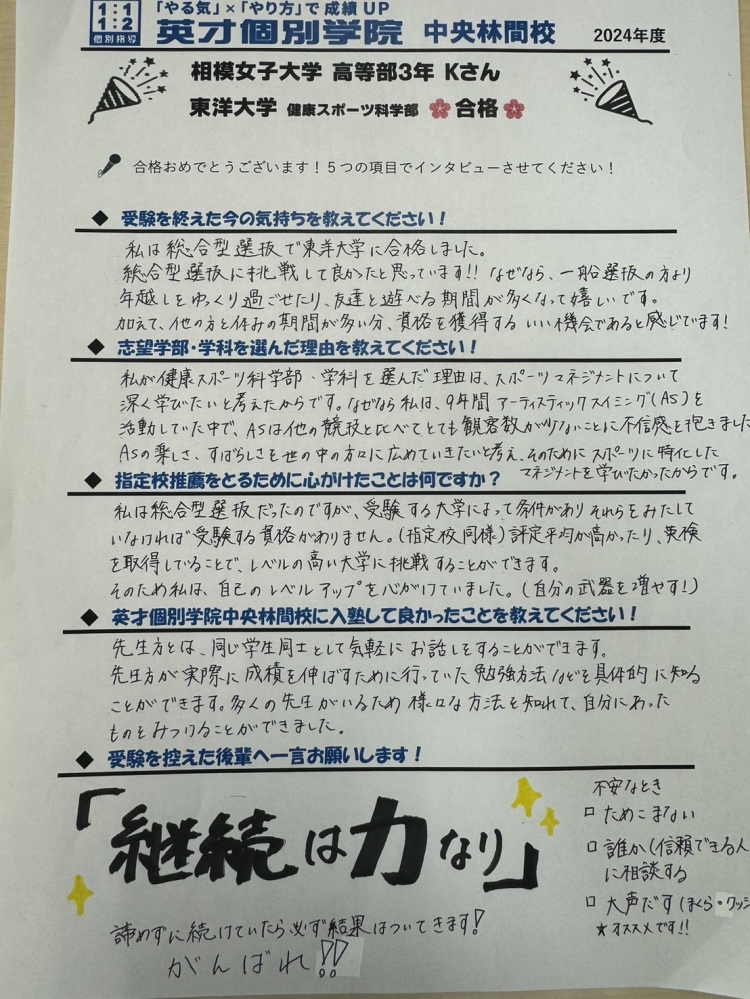 ◆受験を控えている後輩たちにひとことお願いします!