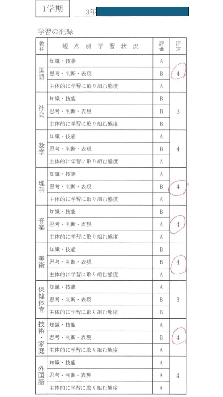 【3年1学期の成績】