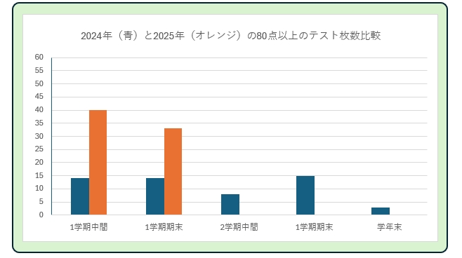 2025年1学期末(赴任してから14ヵ月)80点以上と15点UP以上の合計枚数