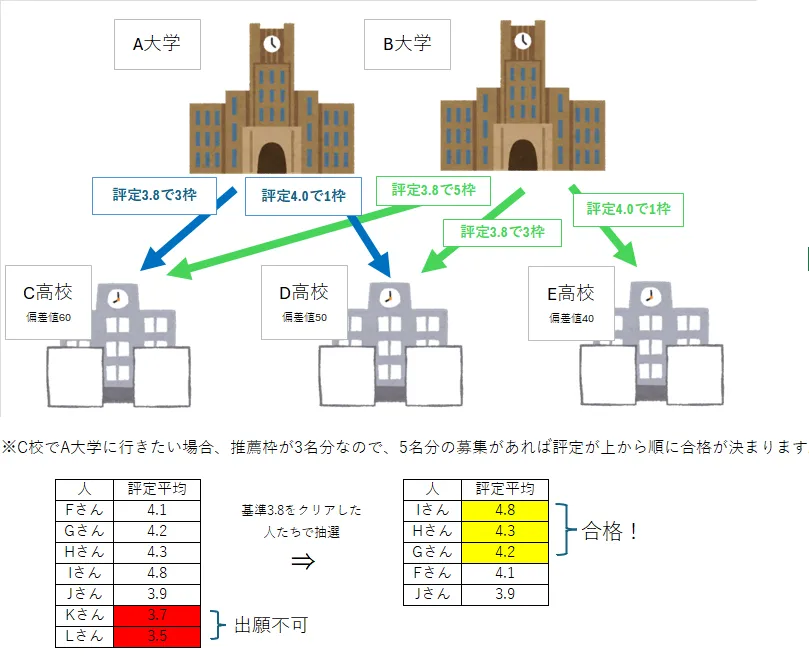「うちへ推薦志願するなら、成績3.8以上の生徒なら3名OKです。」