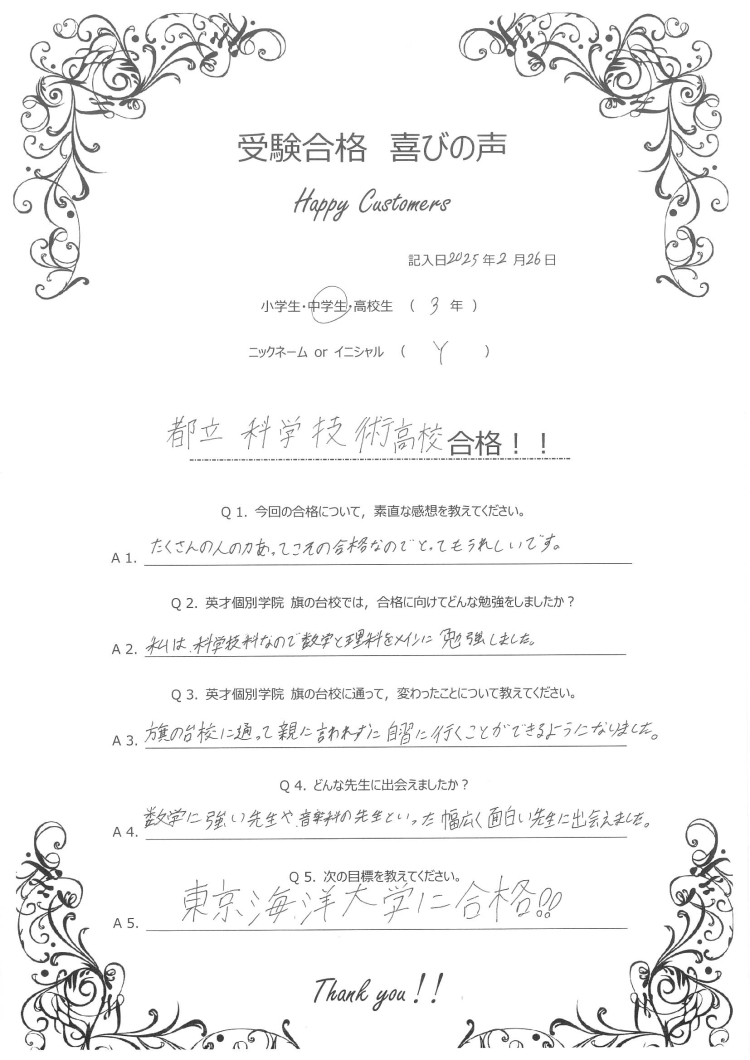 受験合格 喜びの声 【都立科学技術高校】