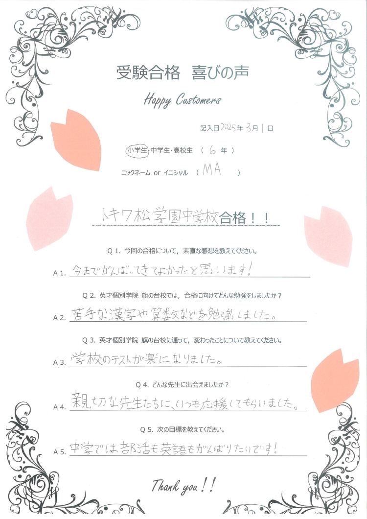 受験合格 喜びの声 【トキワ松学園中学校】