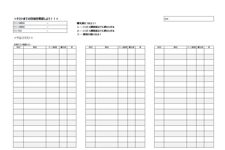 そうならないためにも、「テストの直前にやること」「1週間前までにおわらせること」「2週間前までにおわらせること」