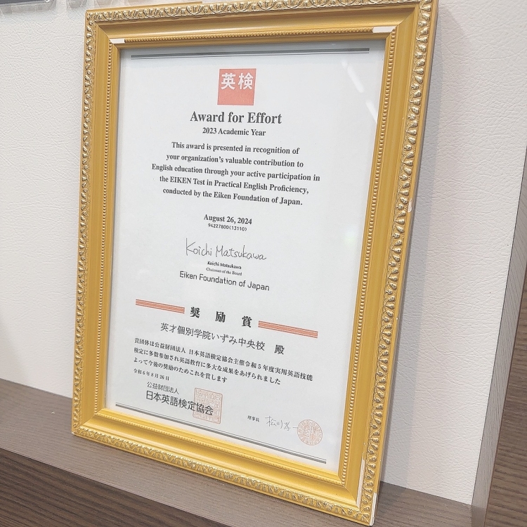 英検協会より、表彰状もいただいています。