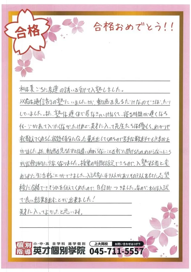 英才に入ってよかったと思います。