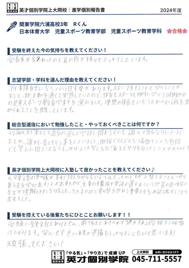 将来保育士になるという目標があります。スポーツをすることで学べることがあると、部活動を通して実感していたので、保育もスポーツも同時に学べる日本体育大学の児童スポーツ教育学科を選びました。理想の保育士になるための知識を深められることを願っています。