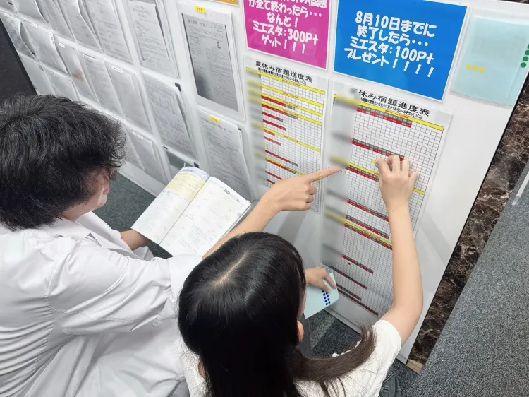 日下部先生が生徒さんと残りの夏休みの宿題計画を立てています。