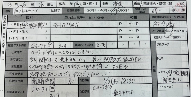 学年末テストが終わった際に、一緒にテストの振り返りをした時、