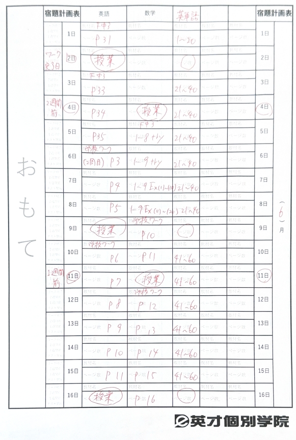 英才個別学院では、生徒さん皆さんに日割りの宿題をお出ししているので