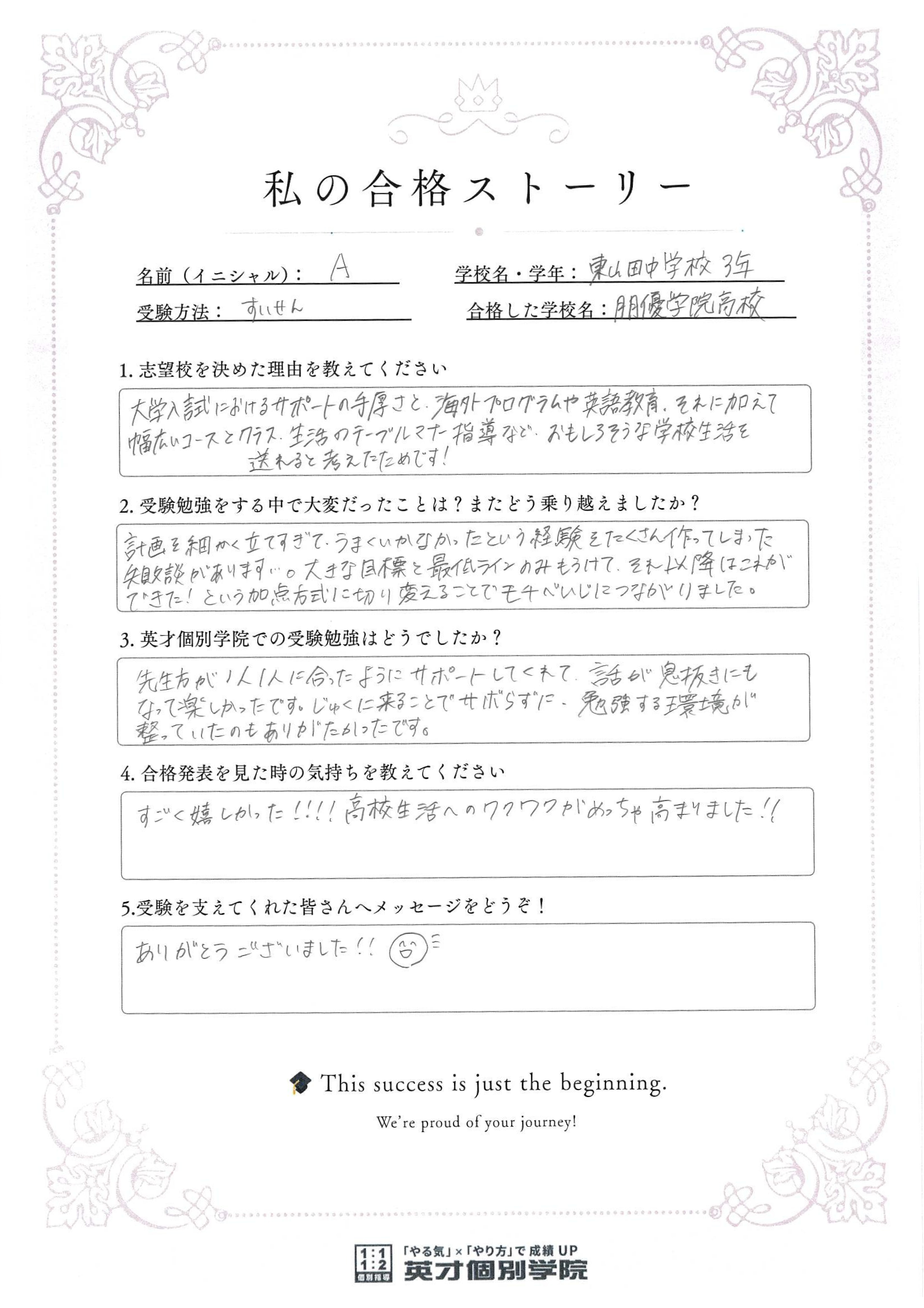 このたび、中学3年生のAさんが私立高校の推薦入試に合格しました!🎉