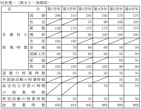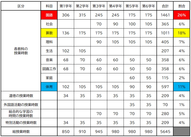 こちらの表は、文部科学省が発表している、小学校の学習指導要領で、学年ごとの各教科の授業時間数を示しています。