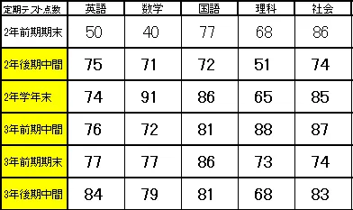 まずは、Sさんがこの半年間で成し遂げた圧倒的な成績アップの結果をご覧ください。定期テストのおいてはスタートも決まり、そこからさらにアップしている科目も複数。英才での受講は英語と数学のみでしたが、元々点数が高かった社会以外は、国語や理科といったところも点数がアップしています。