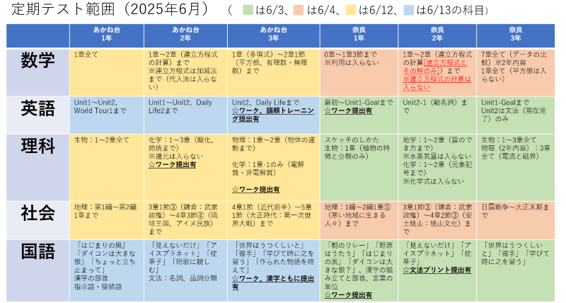 ※ただし、5科目の中でも理科だけは学年や担当する先生によって、“物理、化学、生物、地学”のどの分野からスタートするのか分からないため、毎年同じとは限らないので注意が必要です。また、今年に限り奈良中の場合は3学期制移行により、テスト時期が数週間遅くなるため、上記よりもやや範囲が広くなることを想定しています。