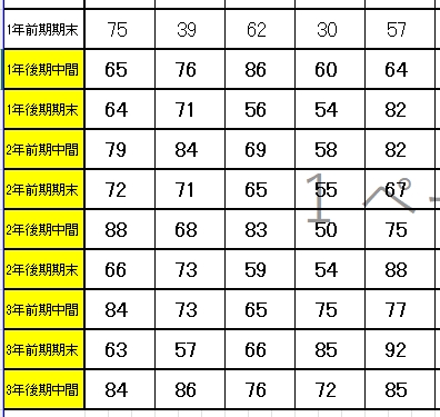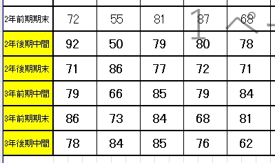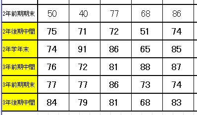 実際に秋に入会した生徒の点数推移を紹介します。(黄色に色付けした定期テストが入会後に受けた定期テストになります)