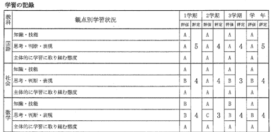 現在は3観点でA~Cの評価がつけられ、