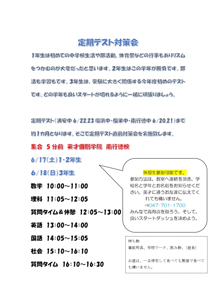 英才に通うお友達に伝えていただく、もしくは教室へ【定期テスト対策に参加希望】とお電話ください。047-701-1700