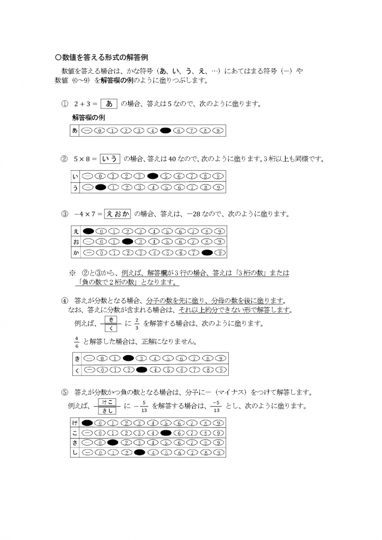 また、負の数の分数が答えの場合は、分母の指定箇所に「-」を塗りつぶします。記述式なら分数の前にマイナスをつけますが、マーク式なら分子の指定箇所にマイナスを塗りつぶすということ覚えておきましょう。