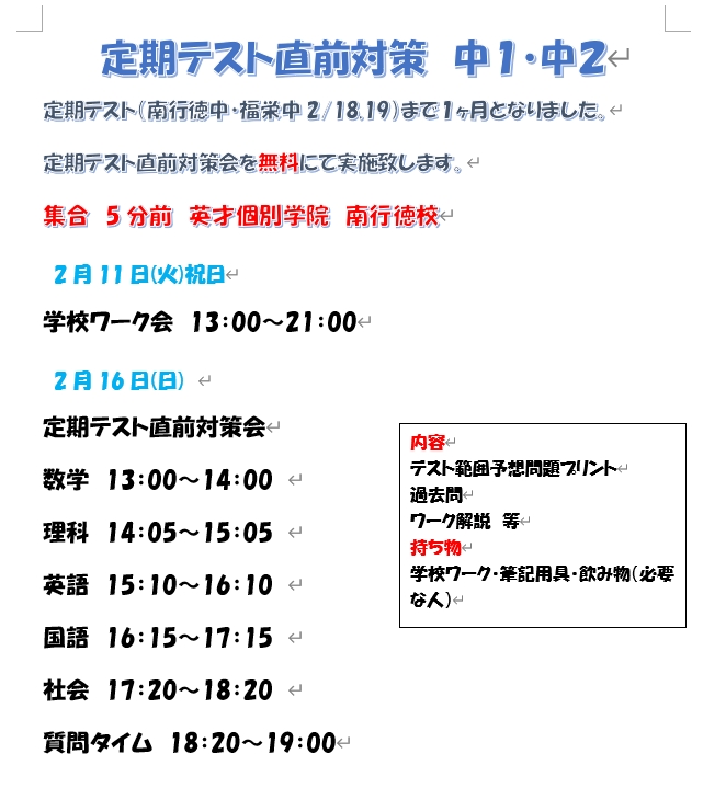 中学1年生・2年生必見!!2月学年末定期テストへ向けて