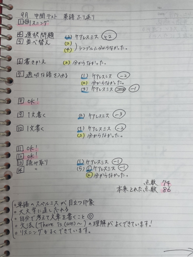 次回も同じミスを防ぎ、高得点を狙うためには、テスト後の振り返りが必須です。