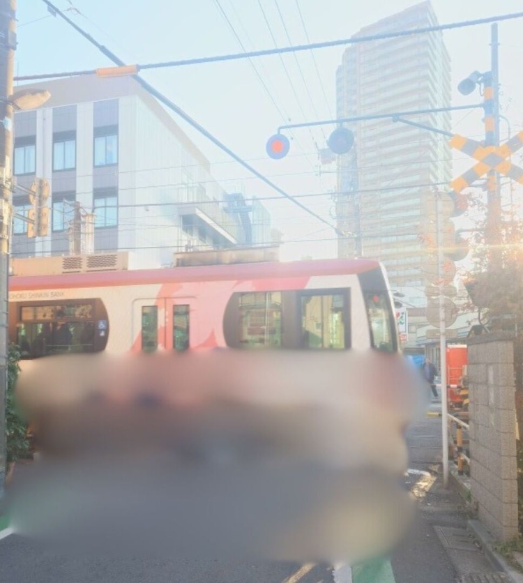都電荒川線の踏切を渡り、