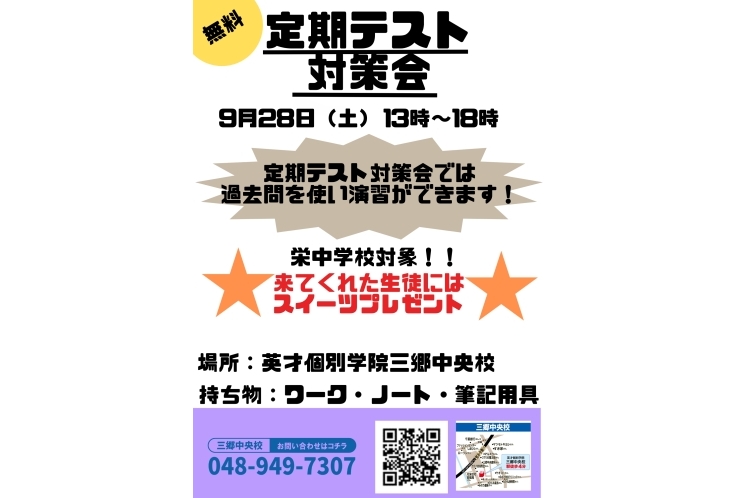 また10月は多くの学校で中間テストが実施されますよね。英才個別学院三郷中央校では、少し前から本格的にテスト対策を始めています。テスト範囲の学校提出物の管理からテスト直前の解きなおしまで、一貫してサポートしますよ!