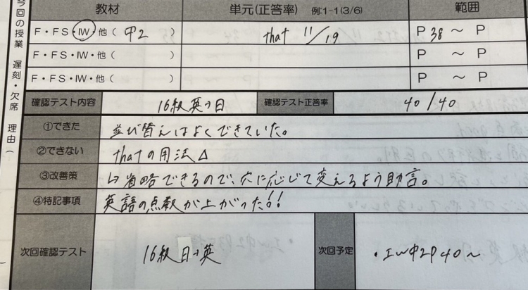 そして、その日行った単元を宿題で出して、次回の授業の際に確認テストで前回の内容を覚えているかできるかの確認をしていきます。「量」「反復」「予習」のお手伝いをします!