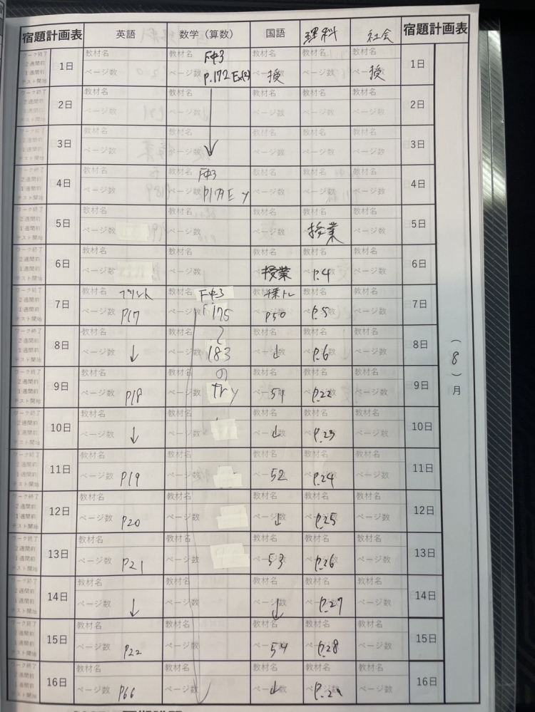 何日になんの科目で何ページやるのかを細かく記載しております。