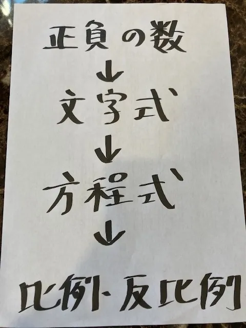 「正負の数」→「文字式」→「方程式」→「比例・反比例」という順番で習っていきます。