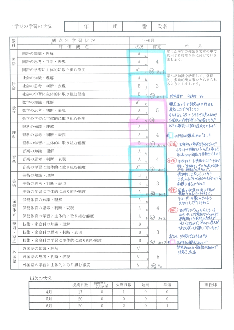 実際に通知表をもらって、3だった!4だった!