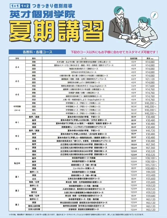 英才個別学院では生徒さんの目標や現状に合わせたカリキュラムを一人ひとり作成をしてご案内しておりますが、お問合せをいただく中で、夏期講習の具体的な費用を聞かれることが多いです。