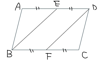 (3)下の図で、平行四辺形ABCDの辺AD,BCの中点をそれぞれE,Fとすると、四角形EBFDは平行四辺形になることを、証明しなさい。