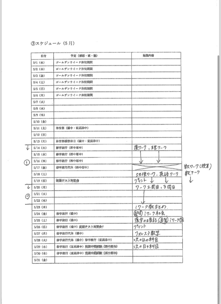 武蔵新城校ではテストまでの勉強計画を生徒さんと立て、やるべきことを明確化しました。