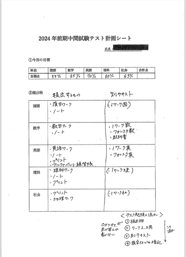 ↑実際のテスト計画表です。(点数アップした西中原中1年Y君のもの)