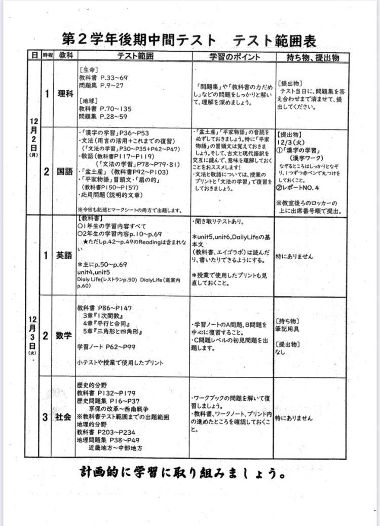 テスト範囲表が配布されるのが約2週間前、部活動が停止になるのが5~7日前だそうです。