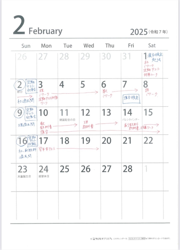 ↓最近学年末試験に向けて立てた実際のテスト計画表です。