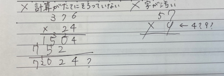 筆算が斜めになってしまったり、自分の文字を読み間違えてしまったりすることで、計算ミスを誘発しやすくなります。