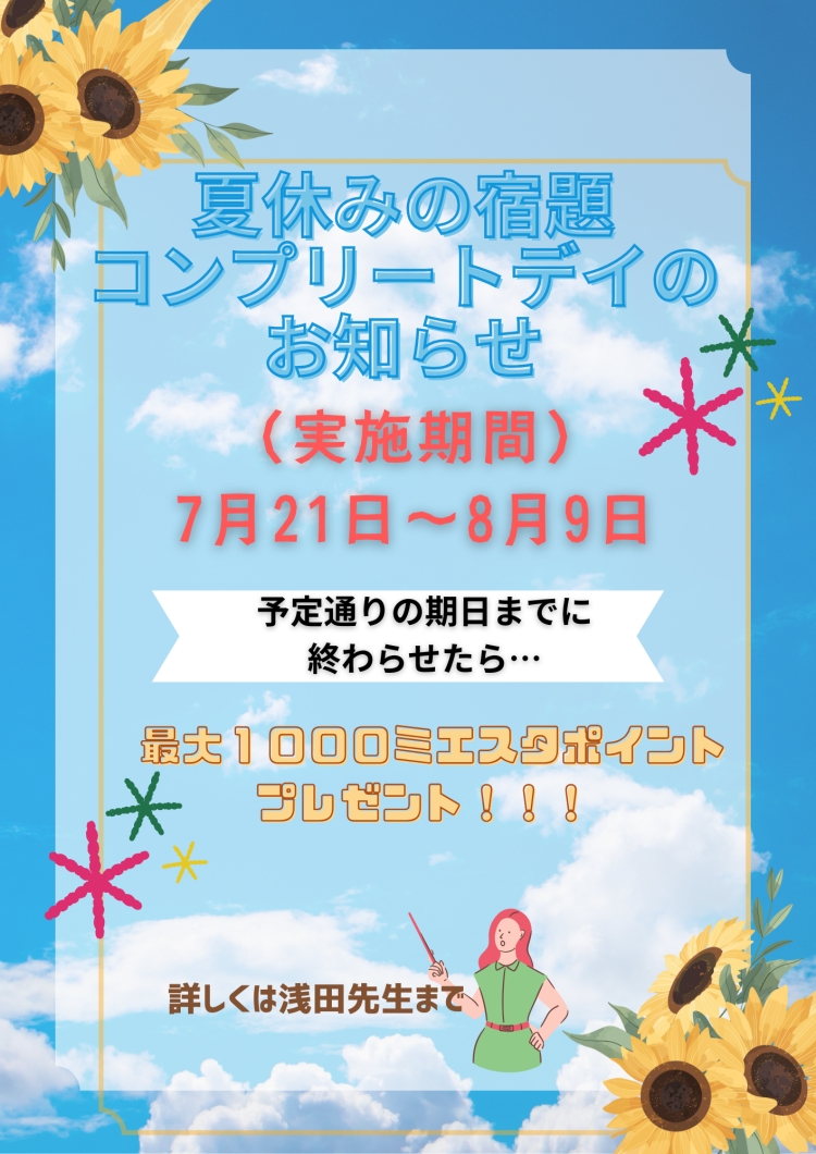 また、武蔵新城校にお通いの生徒さんは、8月9日(土)までに夏休みの宿題(ワークも含め)が全て終わったらミエスタポイント最大1000ポイントプレゼント!!🎁✨