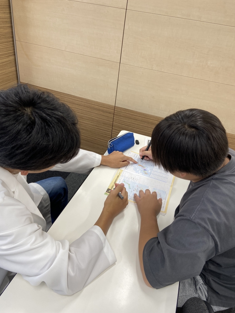 ↓中学2年生のW君は、小槌先生に教えてもらいながら社会のワークを進めました!✍