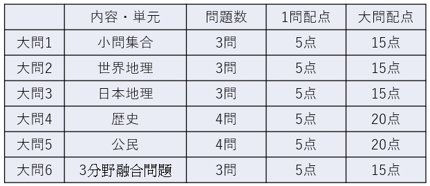地理から地図を読み取る問題、歴史から場所を選ぶ問題、公民から知識を問う問題が出てきます。