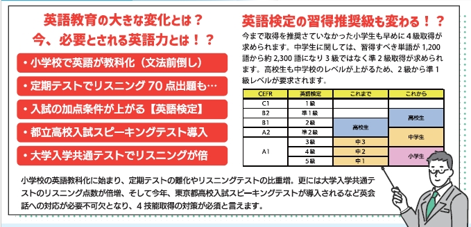 また、小学校からの英語教育も浸透してきて、中学校に上がるときに「英語がキライ」とならないように準備しておく必要性も高くなりました。