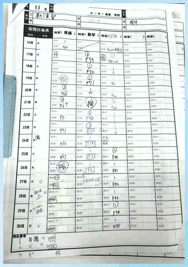 というお子様のために、一人ひとりのスケジュールに合わせた、日割りの宿題を課しています。