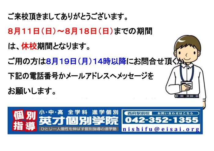 西府駅 府中市西府町の個別指導学習塾【英才個別学院府中西駅前・分倍河原校】よりお知らせ致します。