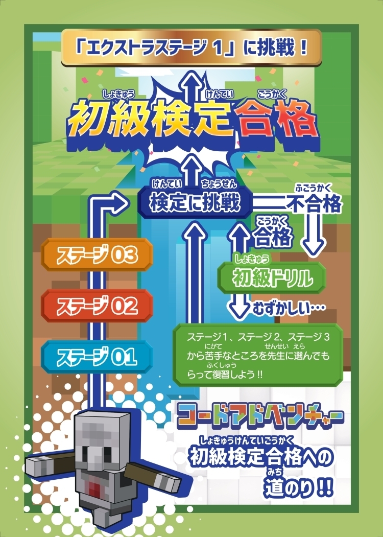 お子様に絶大な人気を誇るマインクラフト。しかし、ただ画面を眺めて遊ぶだけではもったいないと感じることもあるはずです。コードアドベンチャーは、このマインクラフトの世界を舞台に、プログラミングの基礎から応用までを体系的に学べるカリキュラムです。