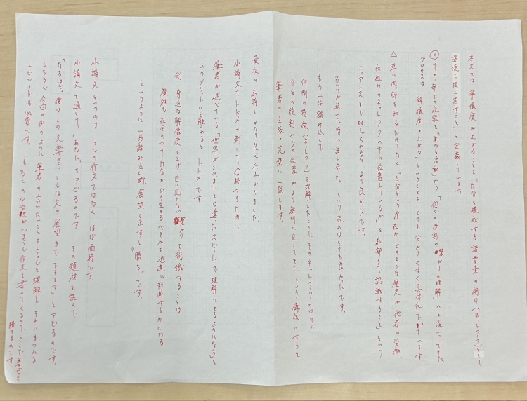 当校の小論文指導は、単に誤字脱字を直すだけではありません。生徒が書いた解答用紙の枠内だけでは足りず、用紙の裏面までアドバイスでビッシリ埋め尽くされることも珍しくありません。
