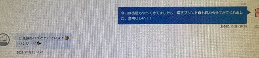 私「今日は宿題もやってきましたし、課題もやってきました」ママ「ご連絡ありがとうございます😊バンザーイ🎉」