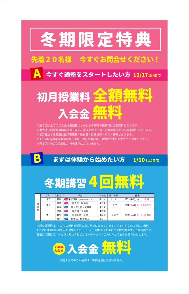※ご入会後3ヶ月以内に「週回数変更・退会・休会」をされた場合、違約金が発生します。※他キャンペーンとの併用はできません。🅱 まずは体験からスタートしたい方へ【冬期講習 4コマ 無料!】📅 体験受付期間:〜1月10日(土)まで学年 科目 単元 コマ数 費用小6 算数 中学準備(正負の数) 4コマ 無料中1 英語 過去形・助動詞 4コマ 無料中2 数学 合同条件・証明 4コマ 無料